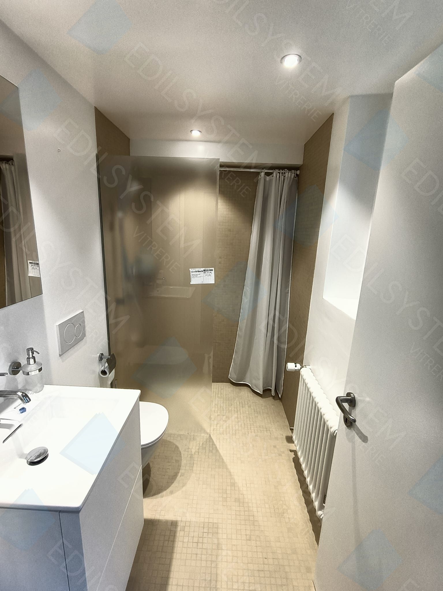 Exemple de réalisation en vitrerie : paroi de douche sur mesure installée à Genève. Pour un devis, une cabine de douche ou une rénovation de salle de bain, contactez EDILSYSTEM Services.